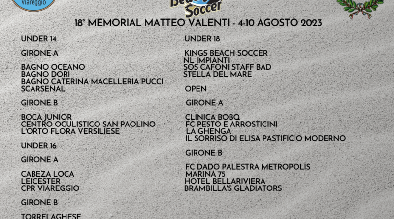 Leggi tuttoSono stati sorteggiati i gironi del 18° memorial “Matteo Valenti” di beach soccer, in programma al beach stadium al Flora